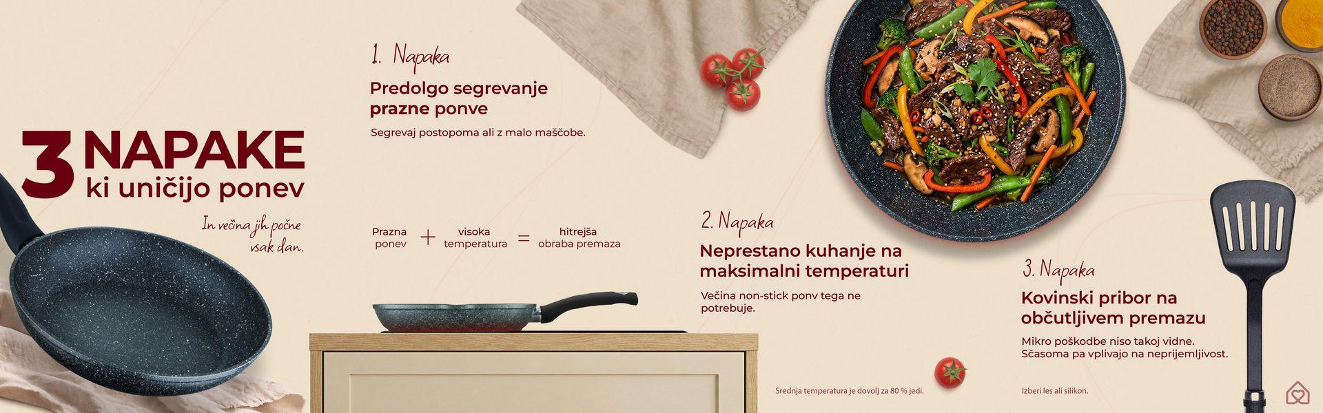 Nasvet: Ko segrevate ponev, to počnite postopoma in pazite, da ne doseže previsokih temperatur, preden dodate hrano. Prav tako je priporočljivo, da med segrevanjem dodate malo maščobe, saj bo ta zaščitila premaz in izboljšala lastnosti ponve.